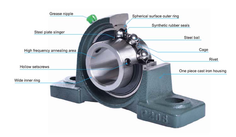 หน่วยเหล่านี้เป็นการผสมผสานระหว่างตลับลูกปืนเม็ดกลม ซีล และตัวเรือนที่ทำจากเหล็กหล่อคุณภาพสูงหรือเหล็กอัดขึ้นรูปซึ่งมีรูปทรงต่างๆ พื้นผิวด้านนอกของตลับลูกปืนที่ตรงกันและพื้นผิวด้านในของตัวเรือนนั้นเป็นทรงกลมเพื่อให้ตัวเครื่องอยู่ในแนวเดียวกัน